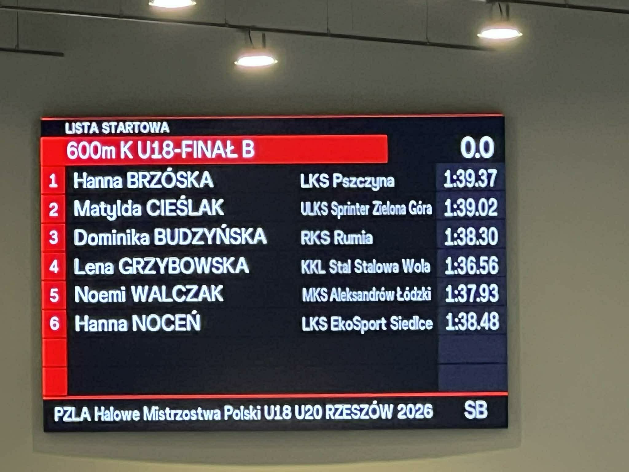 W kategorii U18 na dystansie 600 metrów świetnie spisała się Dominika Budzińska, która awansowała do finału B i ostatecznie została 8. zawodniczką w Polsce. W biegu finałowym uzyskała czas 1:38.60, potwierdzając swoją przynależność do krajowej czołówki. Obecność w finałowych biegach mistrzostw Polski to ogromne osiągnięcie i cenne doświadczenie na przyszłość.